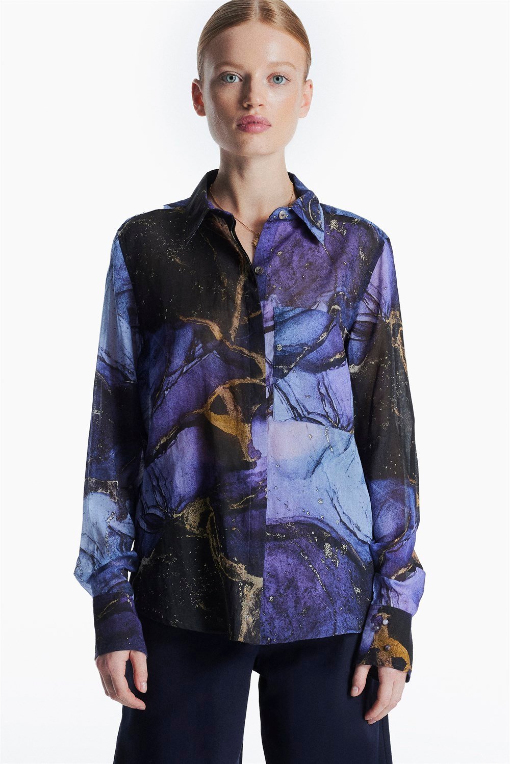 Meaning "Bright" in Japanese, AKIO Shirt was inspired by the healing power of natural crystals. Crafted from %100 cotton voile print, this timeless semi-fitted shirt features a pointed collar, hidden placket and pleated long cuffed sleeves. The natural amethyst on the cuffs and the profound colors add a feminine healing touch. Let your light shine through AKIO...