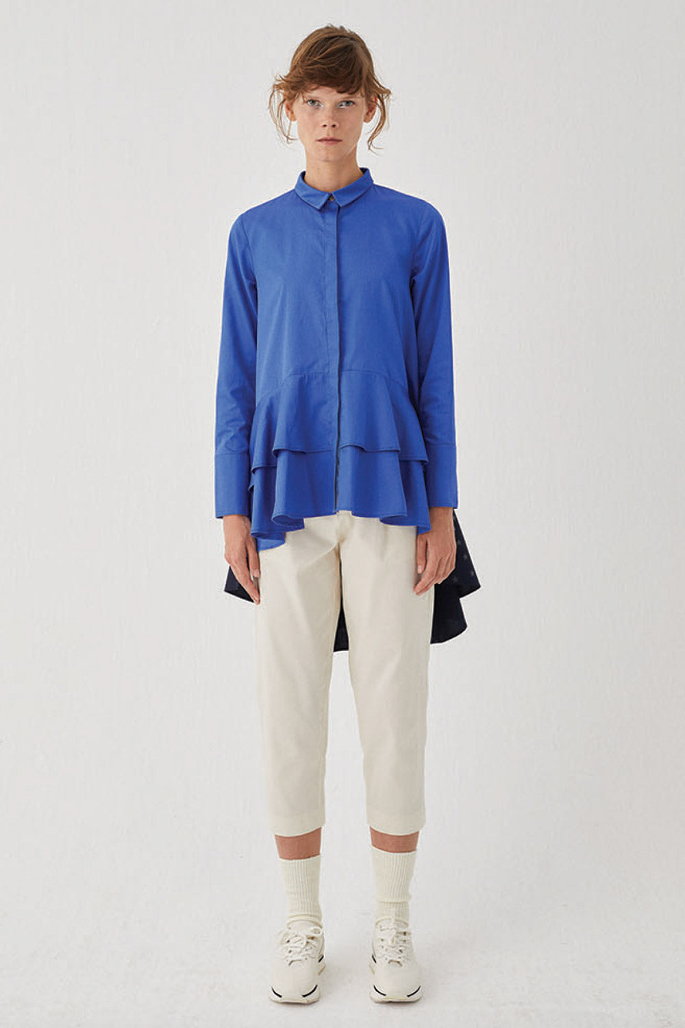 • Pointed collar with a hidden placket