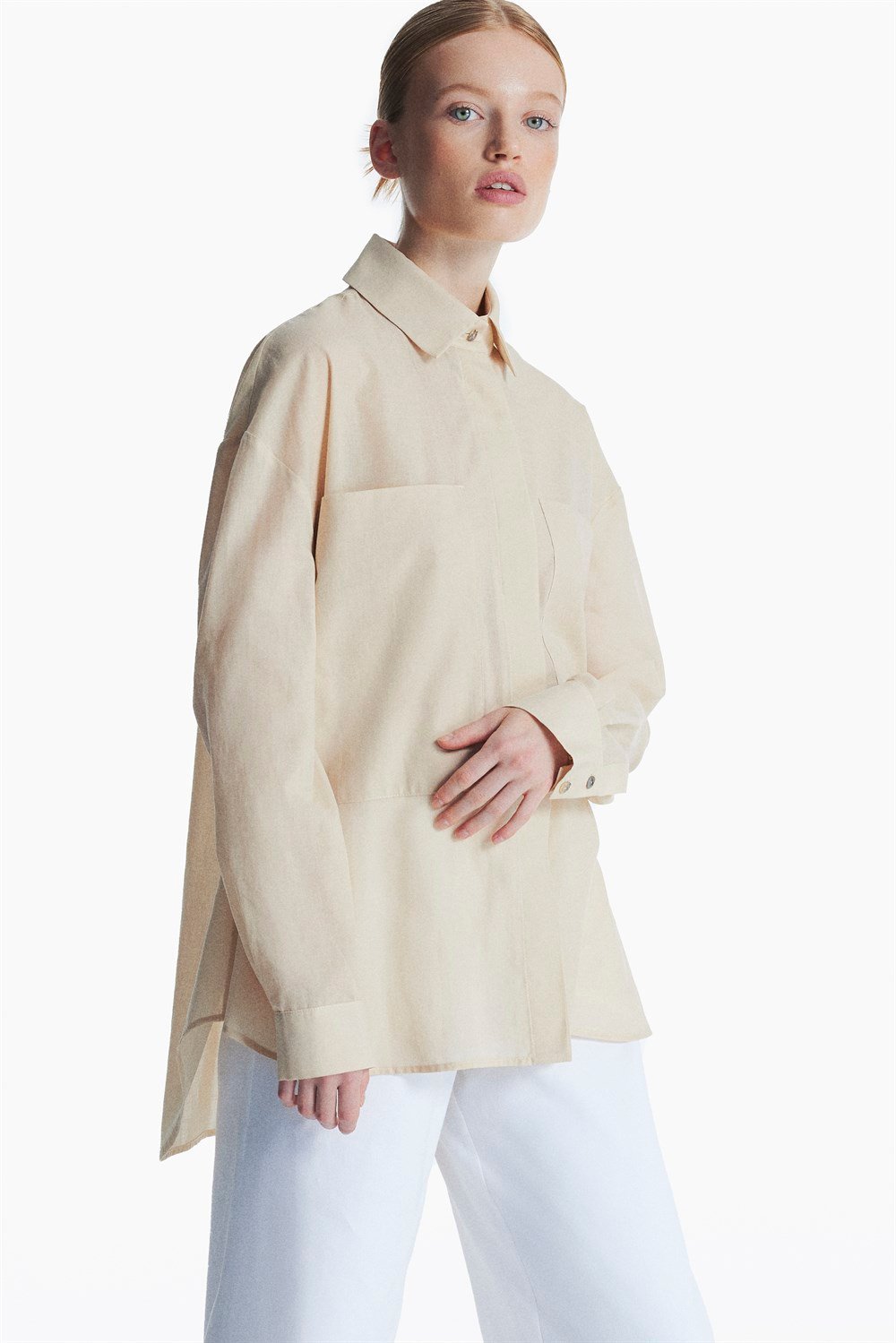 Meaning "Trust" in Japanese, YORI Shirt was inspired by selfconfident women. Crafted from %100 cotton voile, this ultra timeless, shirt is cut for an oversized A-line fit and elevated with a flattering longer back hem and two patch pockets. Let your light shine through YORI...